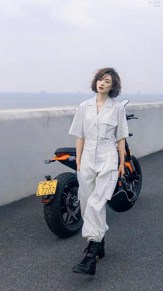 短发的她还有一种少年感,这组非常经典的连体服骑机车的照片就很好地诠释了她的清冷的气质,酷起来的姐姐仿佛湘南海岸的暴走族大姐大!