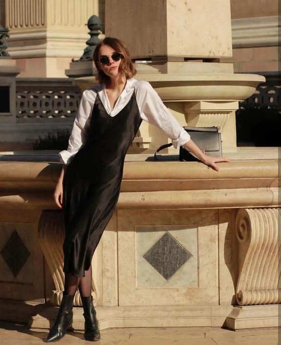 不要总觉得缎面裙就一定是性感、妩媚的代名词,有时候做不到欧美式单穿的open热辣风,不如试试外穿,内搭纯色衬衫不比软妹碎花吊带裙有质感得多?