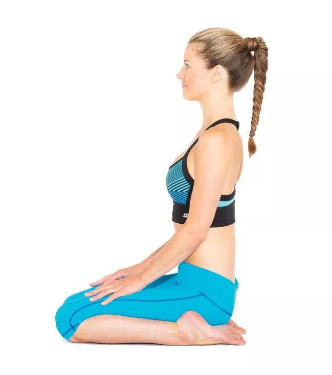 这个体式,如果膝盖离地面很高,可以在臀部下方垫砖,如图中模特示范的那样,把脚掌心朝上,可以缓解膝盖压力