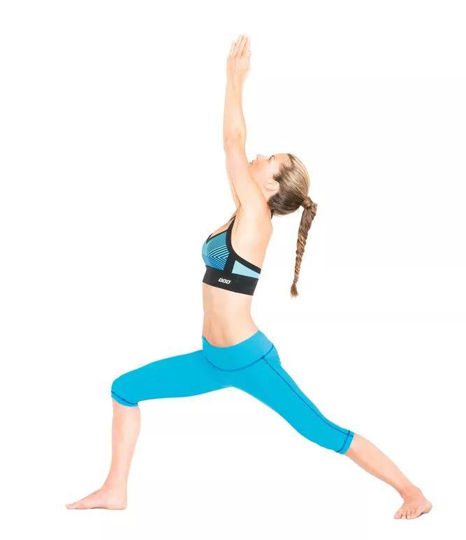 战士Ⅰ式也可以帮我我们做到闭髋的练习。当后侧脚掌向外打开后,要注意保持骨盆的向前,这时就可以感受到髋部向内收的感觉,这里注意不要像战士Ⅱ式一样把髋部向外展开。