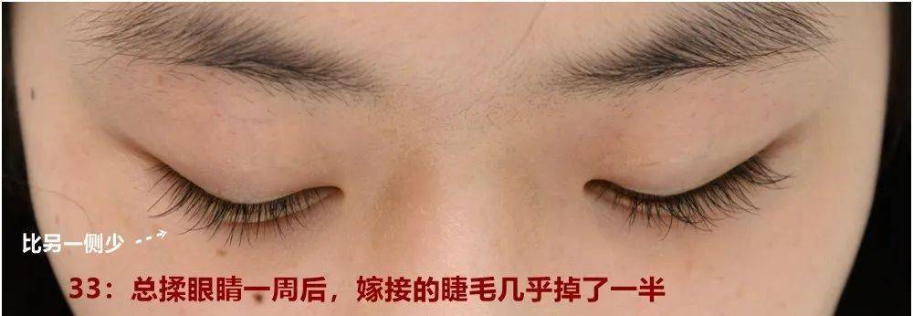 33因为是第一次尝试,常常忘记嫁接了睫毛,用过一次卸妆膏,还总是不自觉地揉右眼。一周后,右眼的假睫毛明显比左眼少,去补睫毛时,美睫师说胶水老化得很严重。