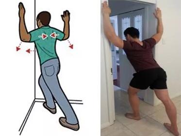 双脚成弓步,双手大小臂成90度,先做动态练习,每一次呼气胸腔向前手推墙,拉伸胸部
