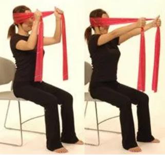 呼气, 保持头部不动 ,双手拉弹力带与颈部形成对抗力量,先动态练习5次,第6次保持3个呼吸