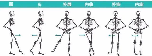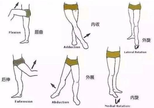 髋关节有6种运动模式: 前屈,后伸,内展,内收,外旋,内旋。